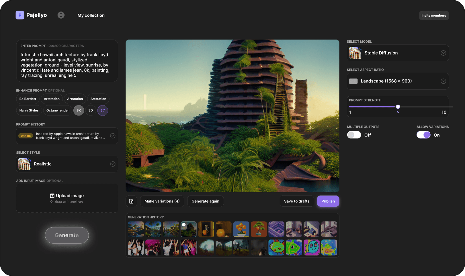 Dream allows you to quickly enter a prompt, add in a style and input image (reference image) and outputs up to 4 generated images.